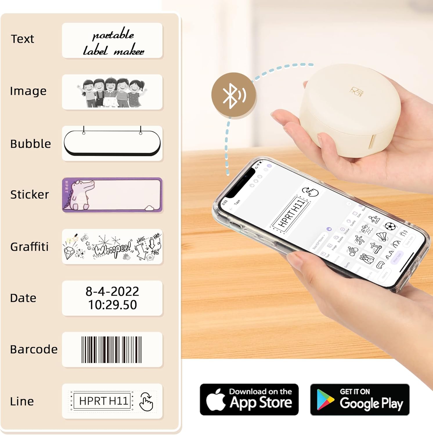 Bluetooth Label Maker: This mini label maker is compatible with Android & iOS, and can be connected to the HerePrint APP which offers 400+ patterns, 60+ fonts and borders. We also provide white/solid color/pattern/clear labels for printing.