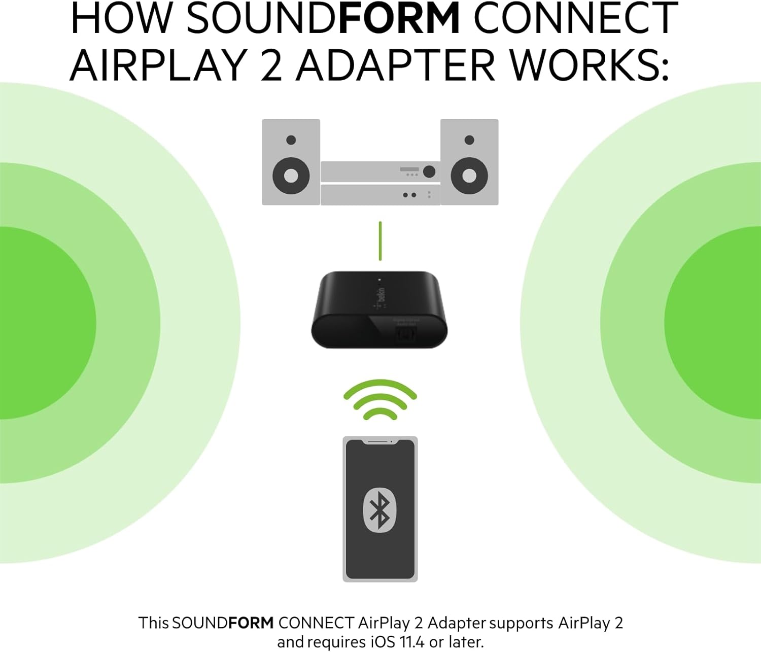 COMPATIBLE WITH iOS 11.4 OR LATER: The SoundForm Connect AirPlay 2 Adapter & Receiver supports Airplay 2 and requires iOS 11.4 or later. Compatible devices include the iPhone 15 Plus, iPhone 15 Pro Max, iPhone 15 Pro, iPhone 15, iPhone 14 & more