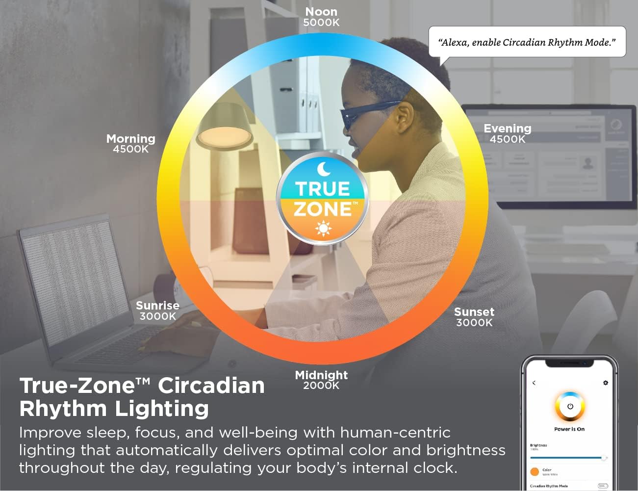 Circadian Rhythm App Mode: Lighting color and brightness that automatically adjusts based on your local time to maximize daytime productivity and help with your body’s natural sleep to wake cycle