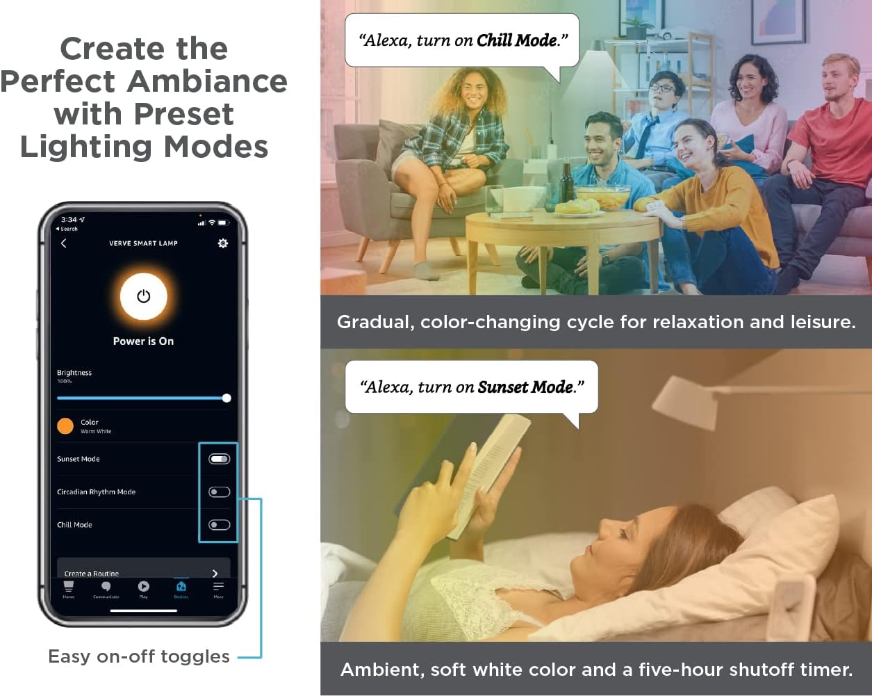 Additional Preset Modes: Choose between Chill Mode with a gradual, color-changing cycle for relaxation or Sunset Mode with ambient, soft white color and a five-hour shutoff timer