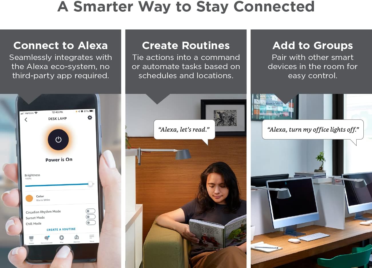 Brilliant design meets convenient control with our BLACK+DECKER Smart Designer Desk Lamp with Clamp Base that’s easy to set up, delightful to customize, and seamlessly integrates with the Amazon Alexa eco-system. Easily bring the light to your workspace with the simple tap of an app or voice command. With a native connection to the Amazon Alexa eco-system, our lights are surprisingly simple to set up, use, and integrate into your daily routines; no third-party app required. Featuring a unique, 2-in-1 design, this sleek light can be secured to vertical or horizontal surfaces up to 3” thick, making it an ideal accent for shelves, headboards, cubicle walls, and more. With three points of adjustability on the lamp, its design has been crafted for ultimate customization, no matter where you need light. And, with endless controls and modes, set the scene for any occasion: wake and sleep with your body’s natural circadian rhythm, work with true white lighting, and unwind to a spectrum of 16 million colors. Durable, sleek, and carefully crafted for premium strength and durability, our Verve Designer Series Smart LED Desk Lamps offers a range of models and options for work, play, and relaxation that seamlessly integrates with the Amazon Alexa eco-system.