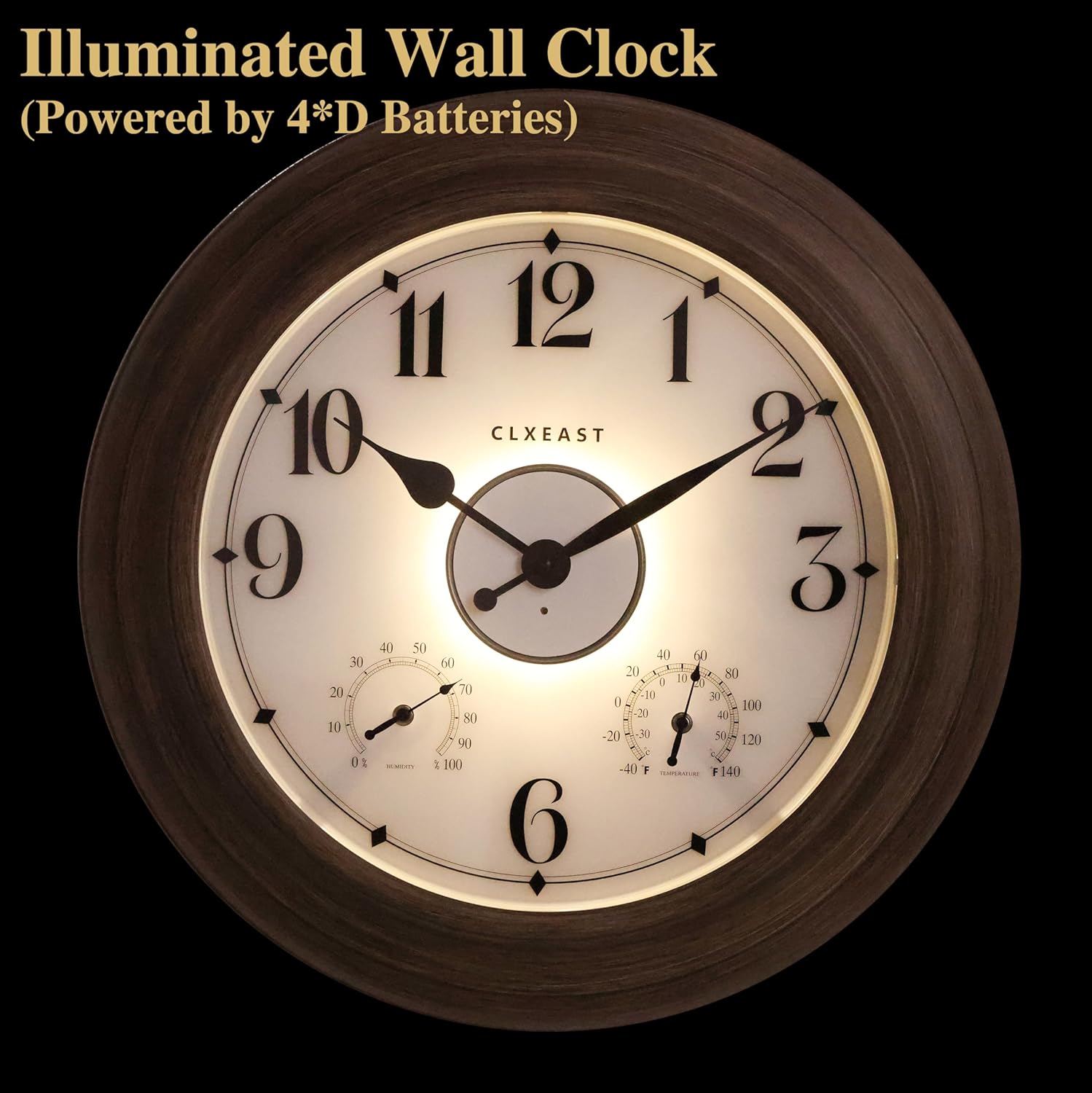 CLXEAST 24 Inch LED Illuminated Outdoor Clocks Waterproof with Thermometer & Hygrometer, Large Lighted Metal Wall Clock with Smart Night Light Sensor,Grey Oak Finish,House Warming Gifts New Home