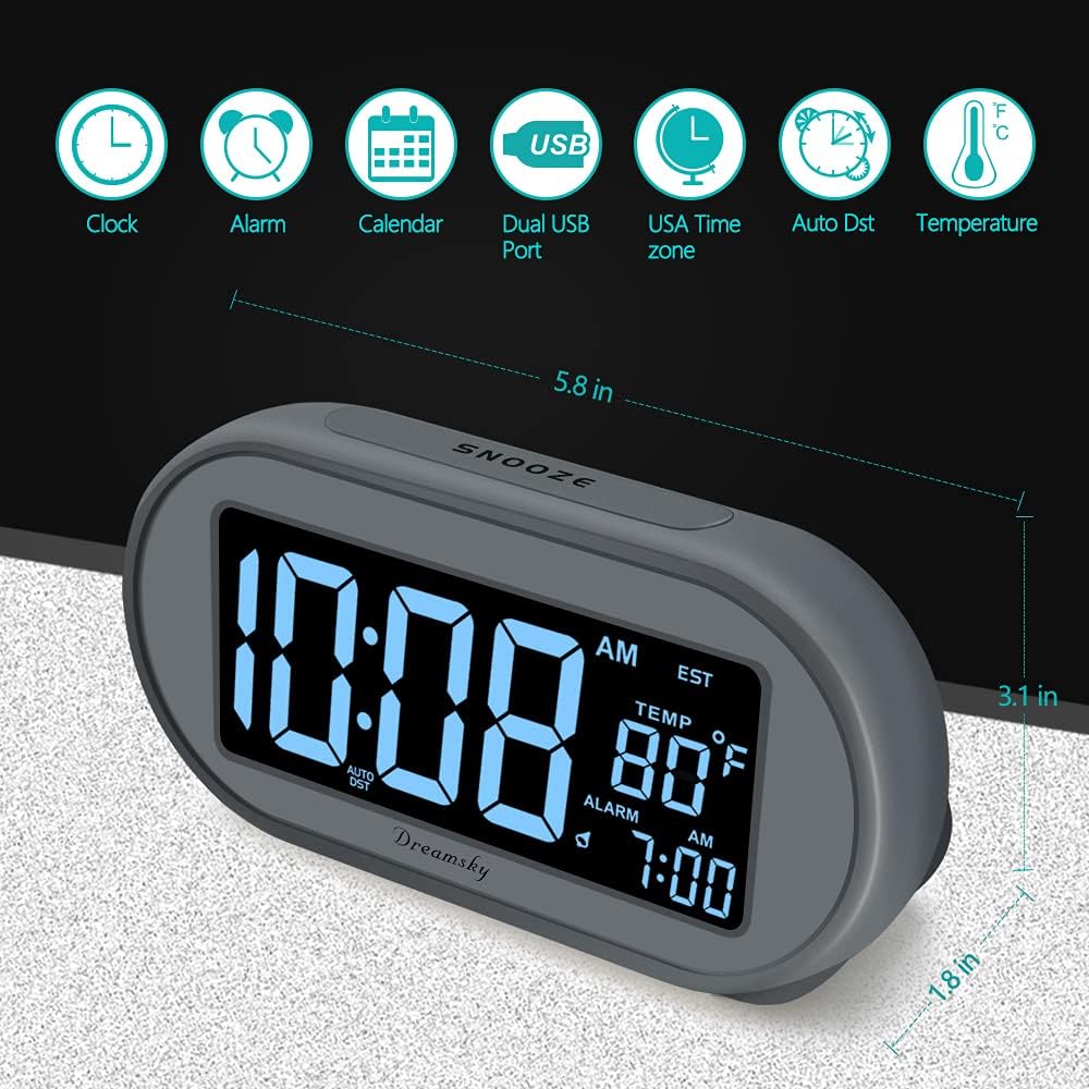 11 reviews for DreamSky Alarm Clocks for Bedrooms, Auto Set Digital Desk Clock for Bedside Nightstand, Electric Clock with Dimmable Brightness Dimmer, Auto DST, USB Port, Date, Temperature, Snooze