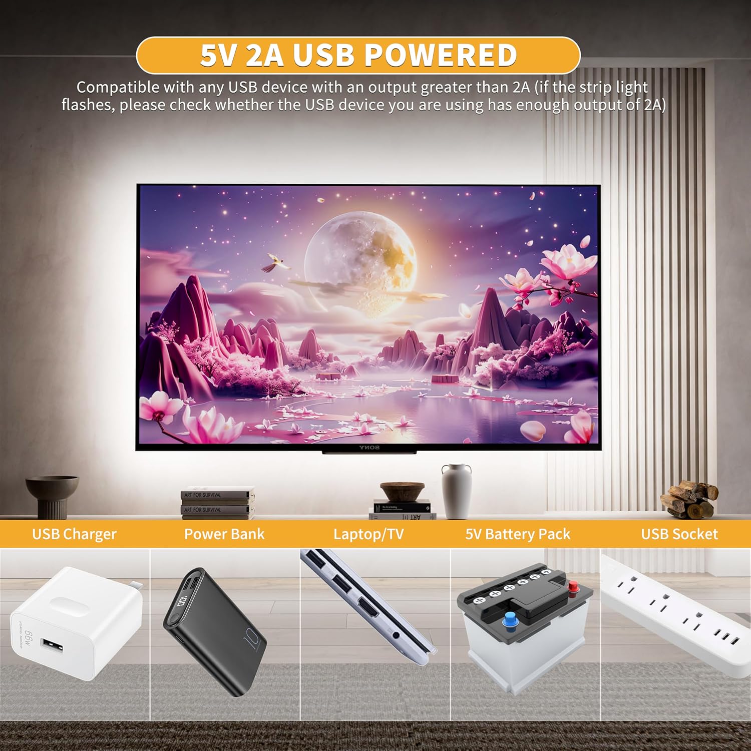 【USB-Powered LONG-LIFE LED Strip&Longer Cable length】 Powered by any device with a USB port that outputs 5V/2A or above, such as TV,computer, desktop, laptop, tablet, tab, car cigar lighter etc.The lifespan is more than 65,000 hours.The length of power cable is 2.6ft,long enough for your DIY lighting
