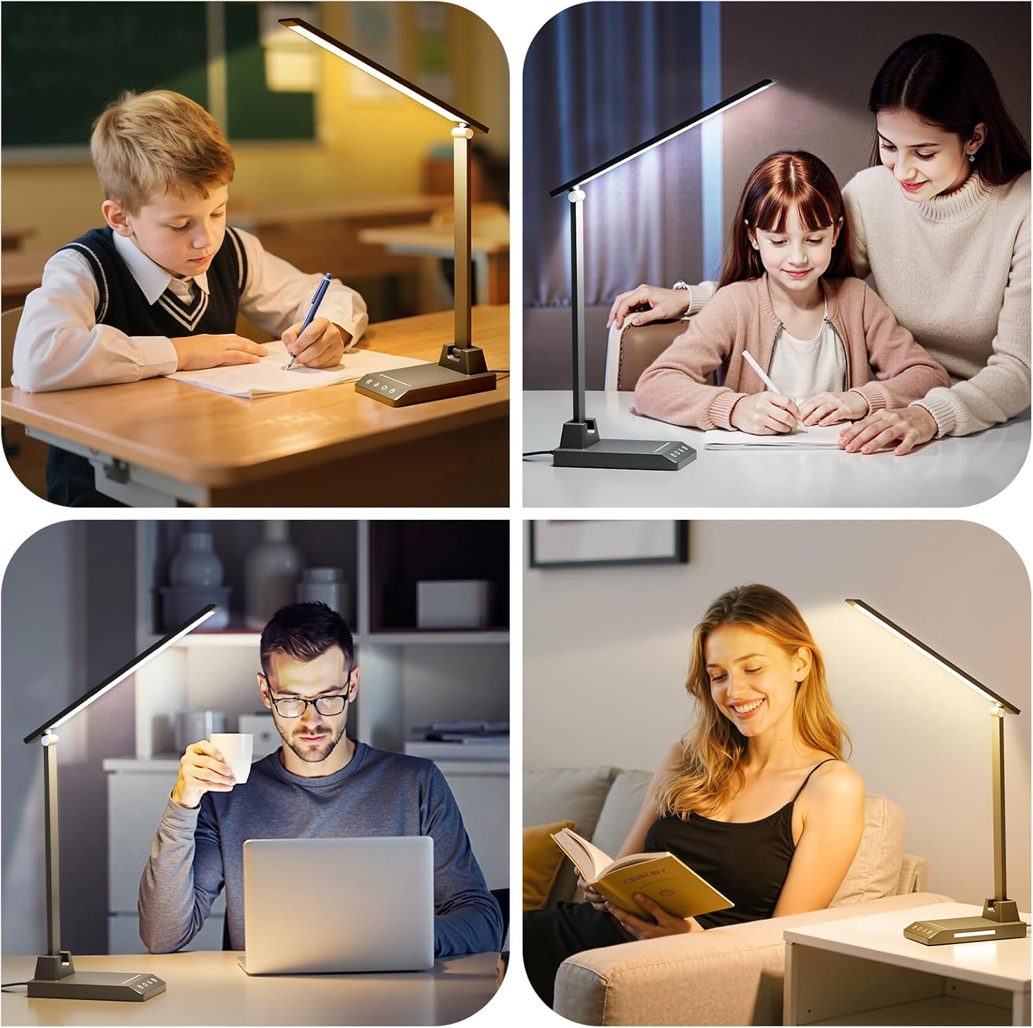 25 Lighting Combinations: Our dimmable desk lamp offers 5 color temperatures (3000K-6000K) and 5 brightness levels (12%-100%), easily controlled via a touch button. From warm, relaxing light to bright, focused illumination, this study desk lamp can adapt to your needs. With a CRI of up to 80+ and SDCM<5, the LED lamp with USB charging port provides natural, vibrant colors and constant radiance. Flicker-free and soft lighting helps reduce eye strain, making it ideal for prolonged exposure.