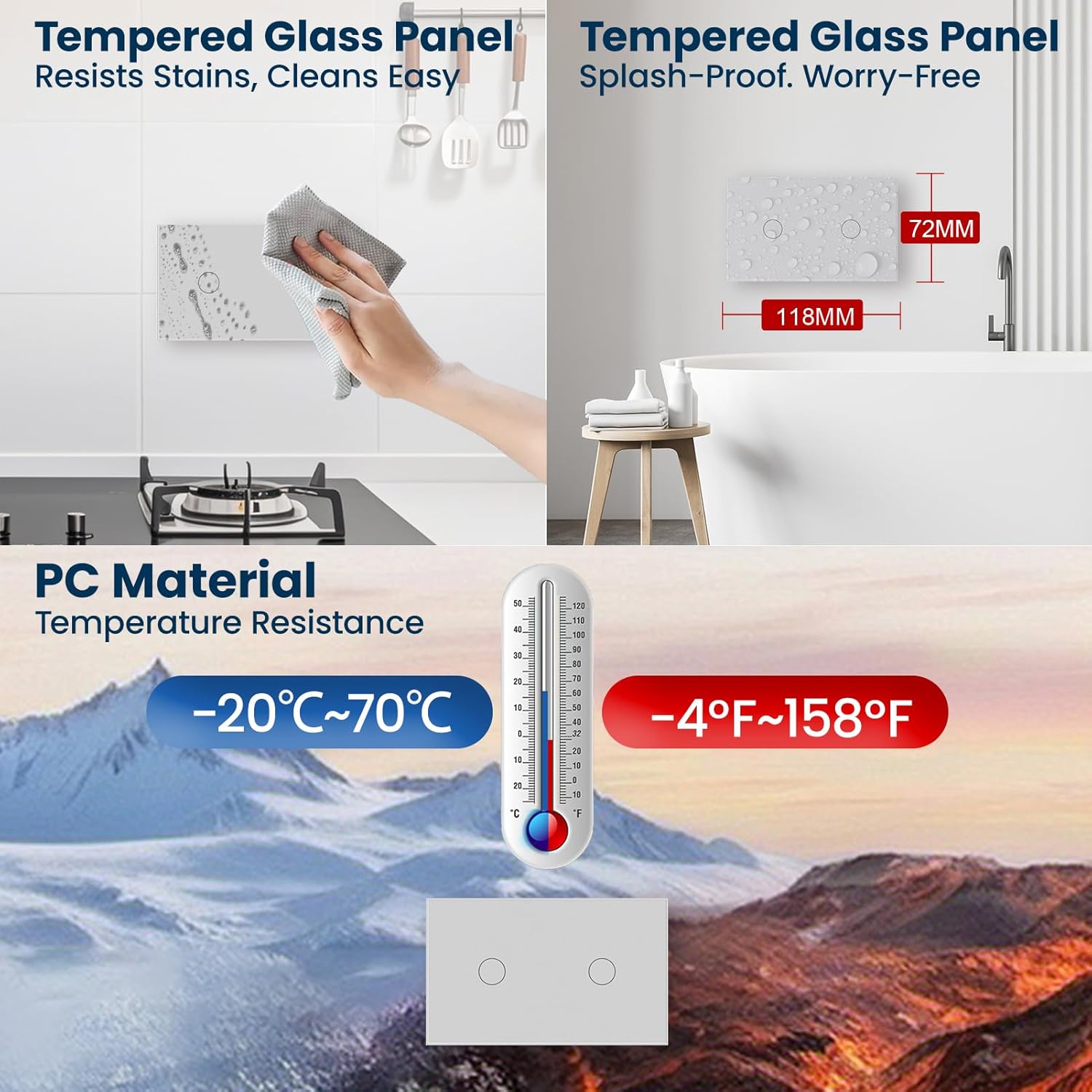 【Product Parameters】Works with worldwide voltages (110V-220V, 50/60 Hz) . Power is 600W.Withstands extreme temperatures from -4°F to 158°F (-20°C to 70°C), and has an IP54 splash-resistant rating, moisture-proof properties make it ideal for bathrooms. Tempered glass surface is easy to clean and maintains a long-lasting smooth appearance.The size of the smart switch is 118X72X34MM