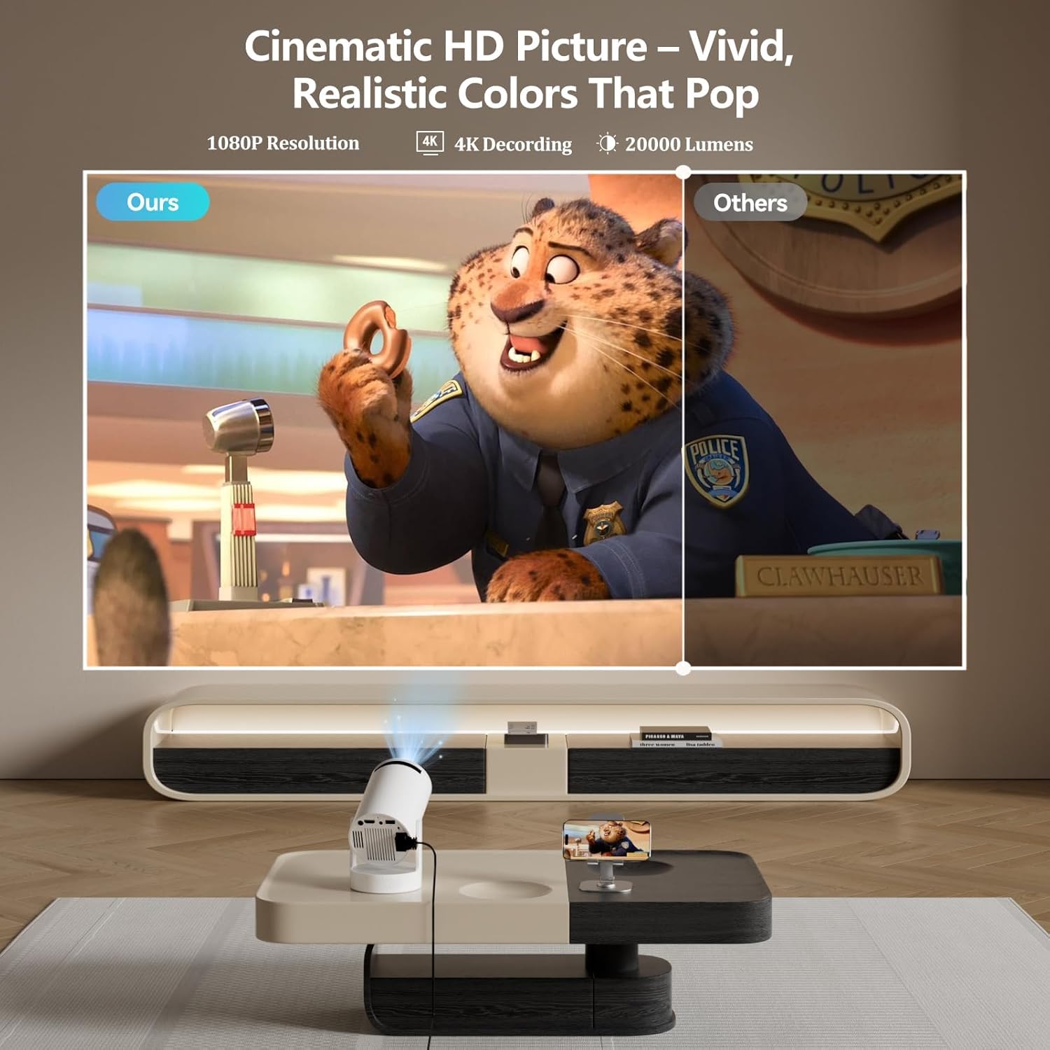 This Smart Mini Projector exceeded all my expectations! The picture quality is incredibly sharp with 1080P Full HD and smooth 4K support, and the 20,000 lumens make the image bright even in rooms with some light. I love that it comes with Android 11 and access to 5000+ apps, so I can stream everything directly without extra devices. The 180° rotatable design, auto keystone, and Wi-Fi 6/Bluetooth 5.0 make setup fast and easy, and the HiFi speakers sound great. Perfect for movies, gaming, or a full home-cinema experience—highly recommend!
